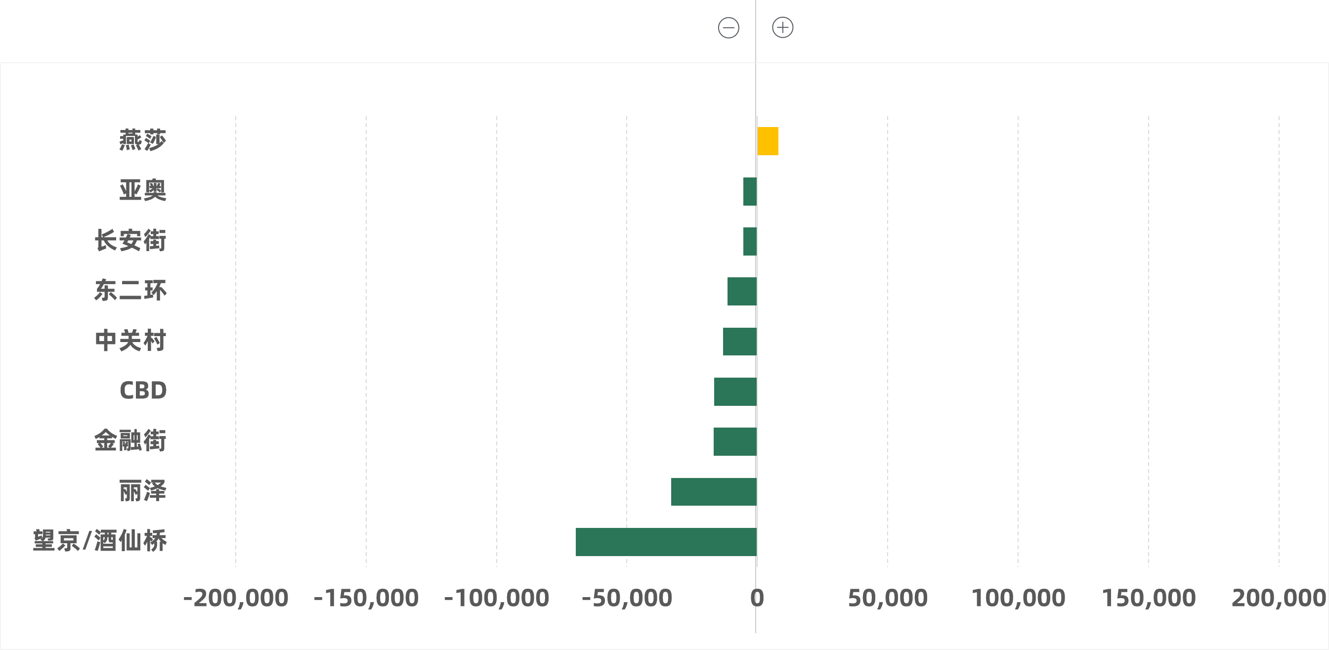 從各商圈成交面積來看,燕莎商圈本季度表現上升,成交面積環比上季度漲幅接近1萬 平方米;其余各主要商圈的成交面積環比均有降低,麗澤和望京/酒仙橋商圈成交面積環比降幅約為3萬平方米和7萬 平方米。