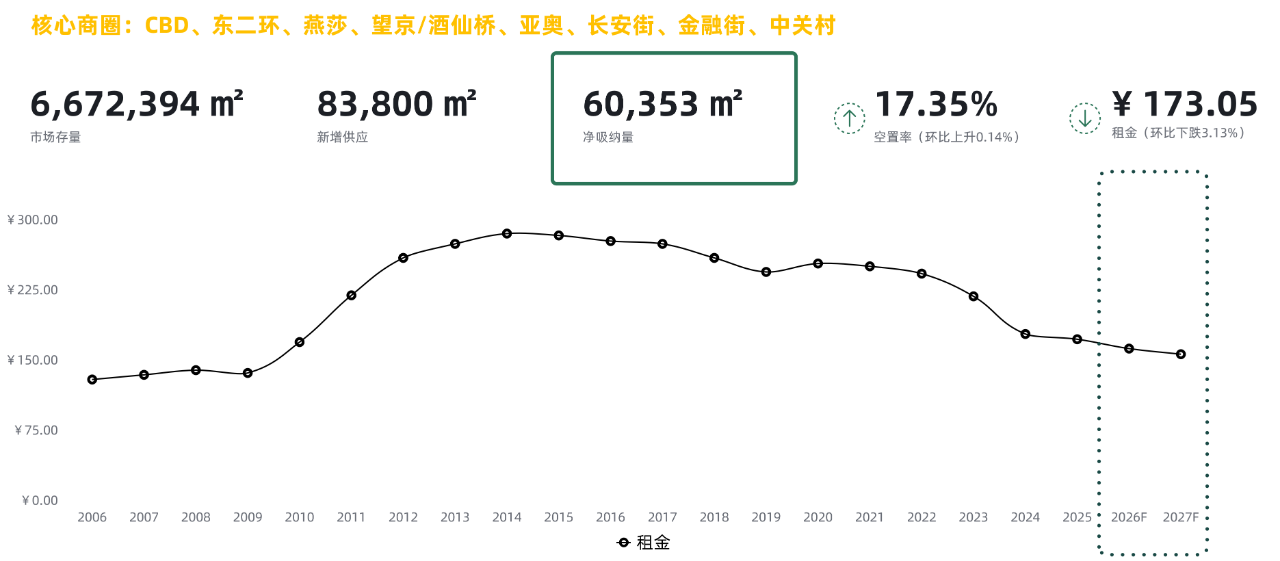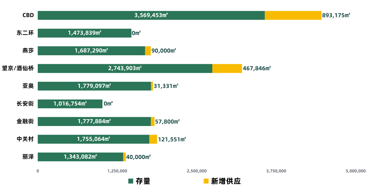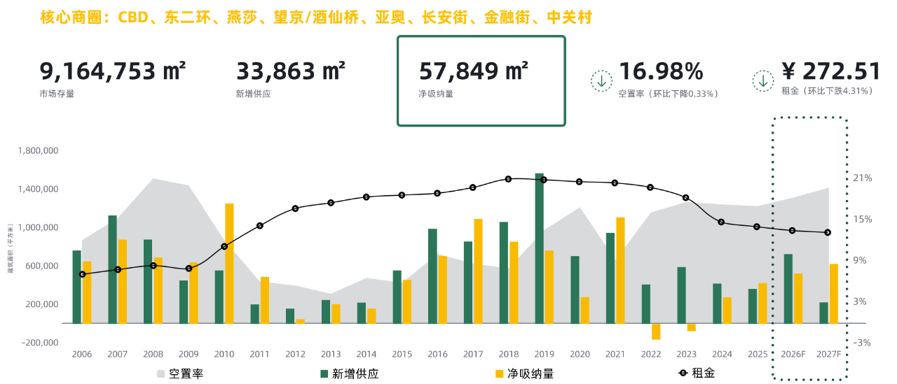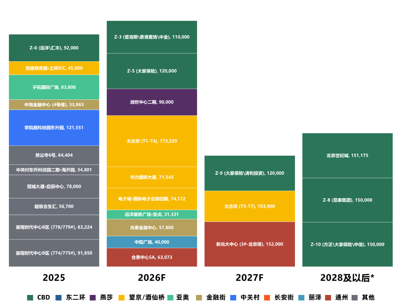 2025年全年投入市場的 新增供應量 預計將超過78萬平方米,其中核心商圈約37萬平方米,甲級寫字樓占比超過五成,持續豐富企業的選擇。在2026-2028年期間,全市主要商圈新增供應量將主要集中在CBD、望京/酒仙橋及亞奧商圈;并在未來,金融街、燕莎、麗澤商圈也將有新的寫字樓項目相繼入市。