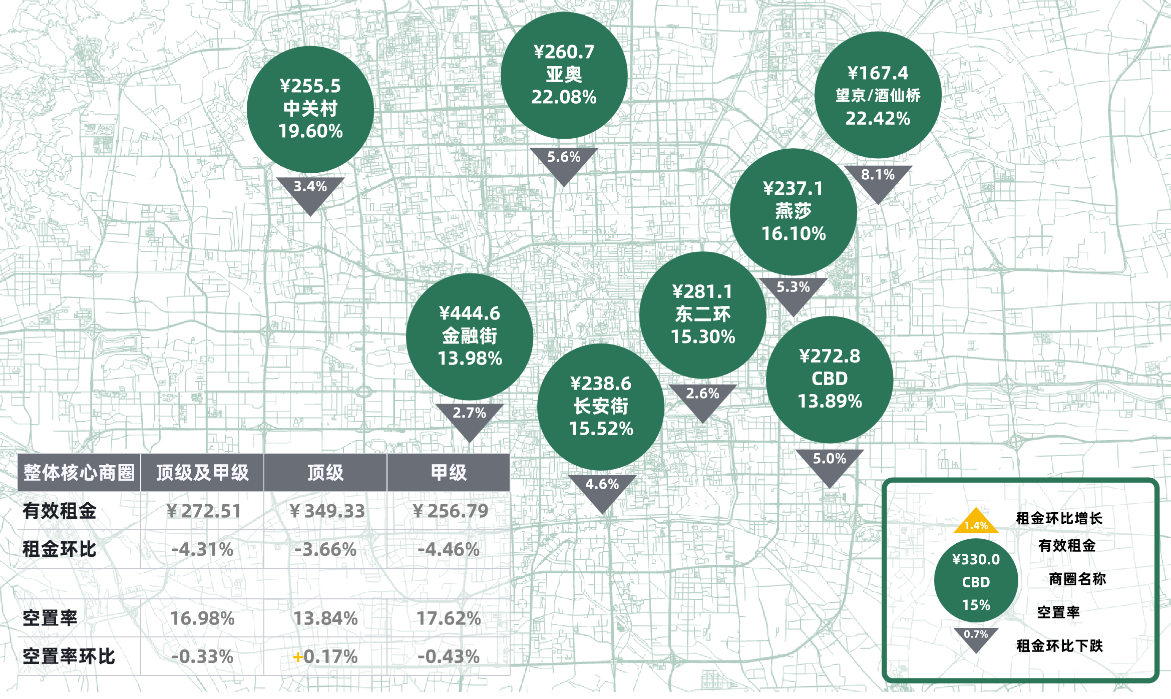 本季度核心商圈 甲級(含頂級)寫字樓凈吸納量 為57,849平方米,空置率環比下降0.33個百分點,錄得16.98%;成交租金延續下行,環比上季度下跌4.31個百分點,為每月每平方米272.51元。